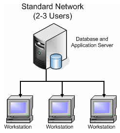 In this configuration, the database and application are on the server while the user interface is on the workstations.
